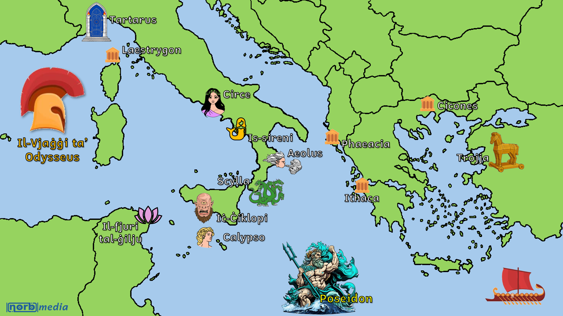 “X’qed tagħmlu hawn?” staqsa r‑re lil Odysseus. “Suppost ilkom li wasaltu Ithaca!”